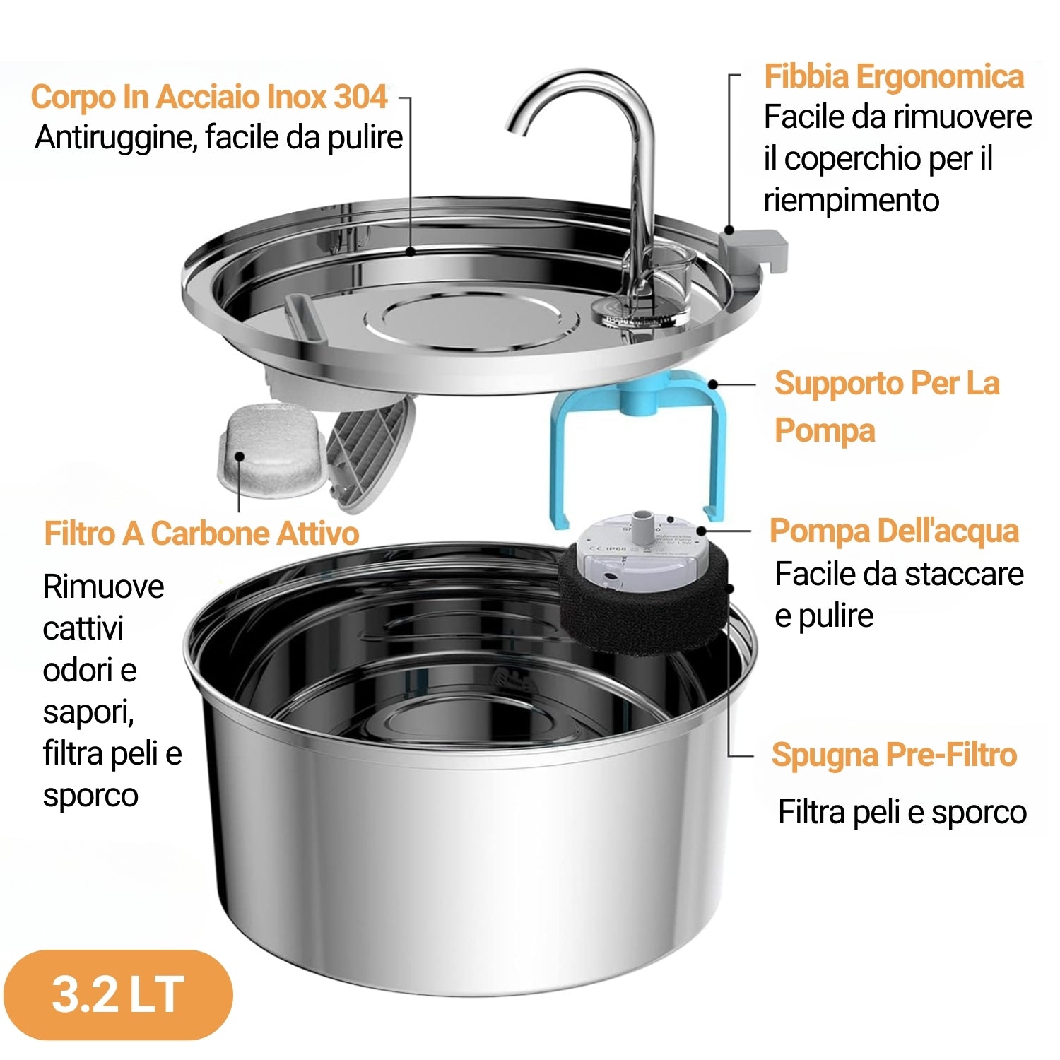 La fontana contiene fino a 3,2 litri d’acqua, garantendo al tuo gatto una buona idratazione per tutta la settimana.